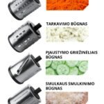 - 4 plieniniai ašmenys, skirti pjaustymui griežinėliais, tarkavimui bei smulkinimui;