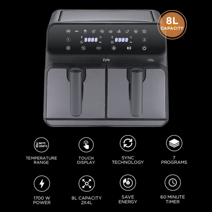 Maisto ruošimas visai šeimai dar niekuomet nebuvo toks patogus! Ši karšto oro gruzdintuvė turi du atskirus, erdvius, 4 l talpos indus, kuriuose pasigaminsite pačius gardžiausius, traškiausius bei sveikiausius patiekalus, kurie tiks visai šeimai. Tiesiog sudėkite norimus ingredientus į šiuos indus, pasirinkite programą ir karšto oro bangos juos pavers gardžiai iškepusiu maistu.