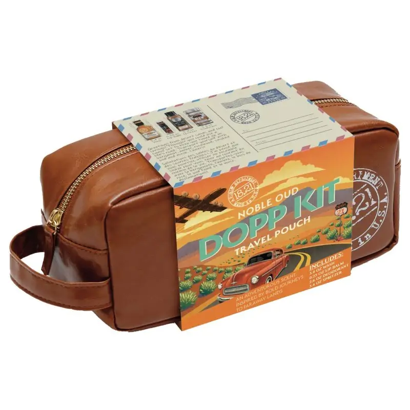 18.21 Man Made „Dopp Kit Noble Oud plaukų ir kūno priežiūros priemonių rinkinį vyrams sudaro 18.21 Man Made „Wash Noble Ouddaugiafunkcė priemonė vyrams, 18.21 Man Made „Deodorant Noble Oud dezodorantas, 18.21 Man Made „Spritzer Noble Oud kūno dezodorantas ir 18.21 Man Made „Lip Balm Old Fashioned lūpų balzamas.