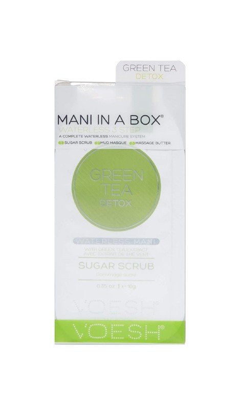 Voesh „Waterless Mani In A Box 3 in 1 Green Tea detox“ yra speciali, be vandens naudojama, „3 viename“ principu veikianti procedūra rankoms. Procedūra susideda iš trijų etapų priemonių: šveitiklio, purvo kaukės ir masažinio sviesto. Priemonės praturtintos žaliosios arbatos ekstraktu, kuris efektyviai detoksikuoja rankų odą. Veganiška formulė. Sudėtyje nėra parabenų. Gaminant neatlikti bandymai su gyvūnais.